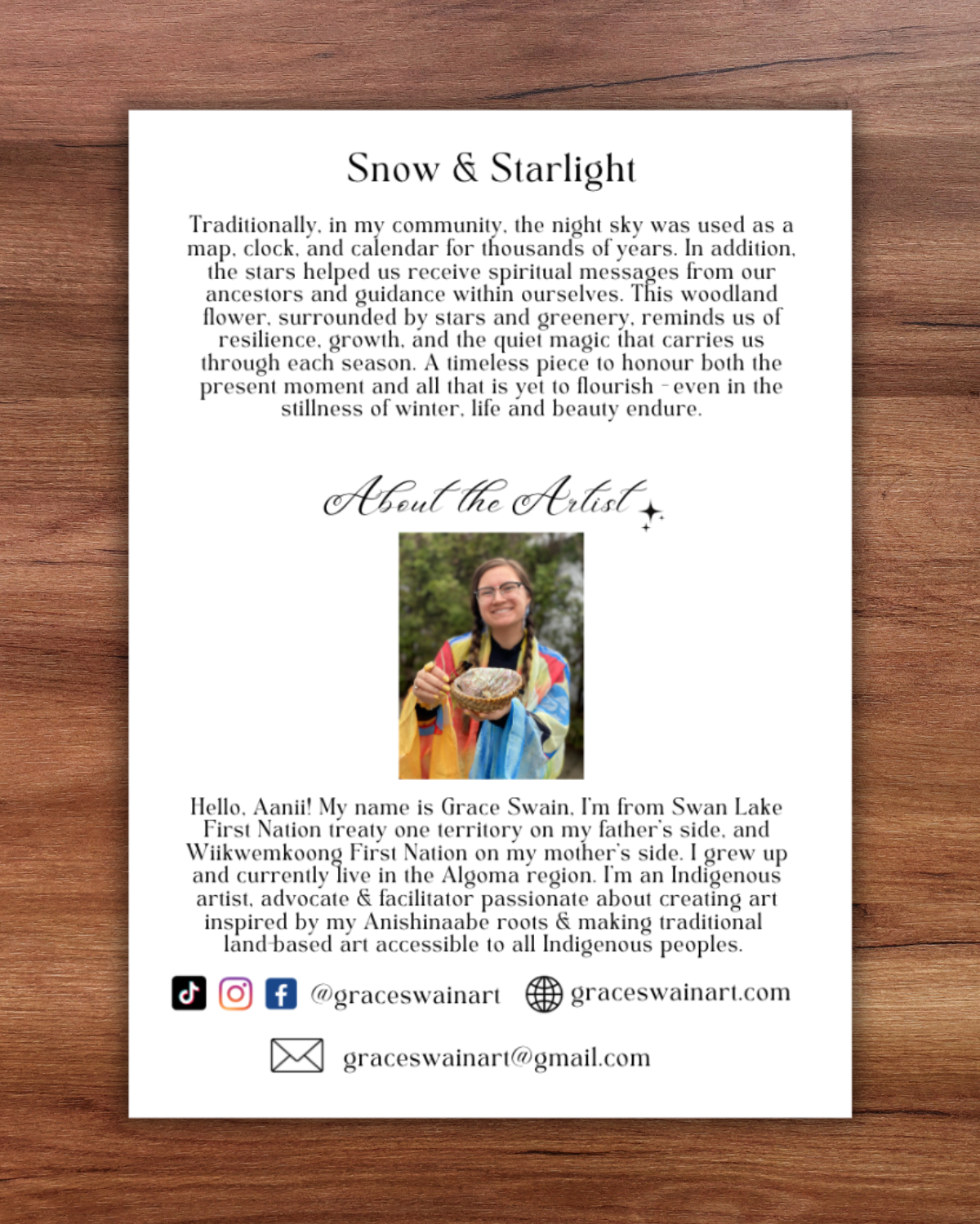 Traditionally, in my community, the night sky was used as a map, clock, and calendar for thousands of years. In addition, the stars helped us receive spiritual messages from our ancestors and guidance within ourselves. This woodland flower, surrounded by stars and greenery, reminds us of resilience, growth, and the quiet magic that carries us through each season. A timeless piece to honour both the present moment and all that is yet to flourish - even in the stillness of winter, life and beauty endure.